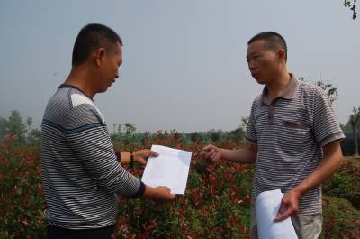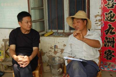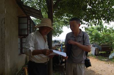 21日,云梦县林业局工作人员,带着《民主评议政风行风评议表》深入林农田间地头,访贤问计,征询林农对林业部门的意见和建议。图为林业工作人员在伍洛镇中丁村、道桥洋湖村征询林农的意见建议。视界网 陈保忠 何贵平 摄