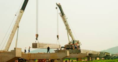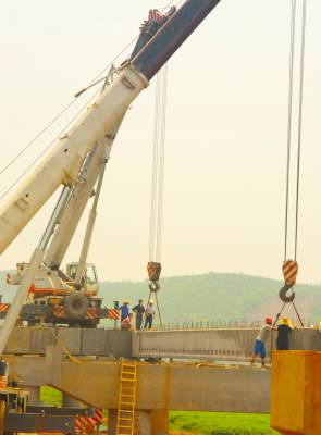 5月22日,两台大功率的吊车将一根重约40余吨、长24.5米的预应力混凝土空心大桥梁板吊起,稳稳地放在湖北省武穴市公路第一桥---程家林大桥第7孔的桥墩上,工程负责人--武穴交通运输局副局长李志方告诉摄影师:程家林大桥原定汛前梁板吊装完毕计划可提前实现!