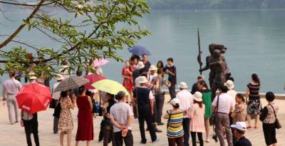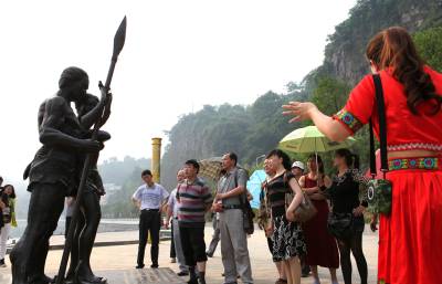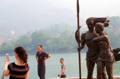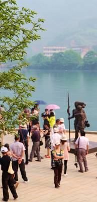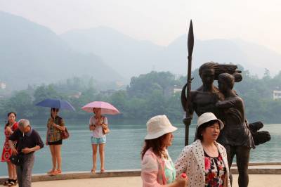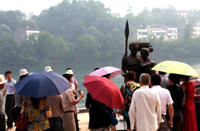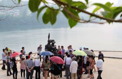 5月22日,来自江苏的一个旅游团队在慕名观赏城市雕塑《盐水情爱》。5月上旬,“中国十大正能量城市雕塑评选”揭晓,湖北省宜昌市长阳土家族自治县的一尊名为《盐水情爱》的城市雕塑入选,成为湖北省唯一入选的城市雕像。有网友提出,“十大正能量城市雕塑”拥有“力量感”、“爱”和“协作”三要素。据当地旅游部门介绍,由于超高的网友人气,该县已把此雕像作为新景点纳入了旅游线路推介。