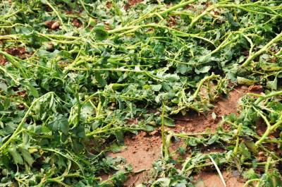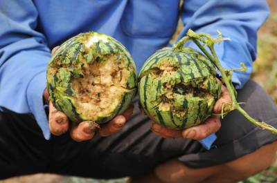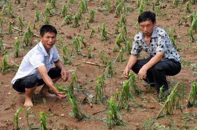 该县杨溪铺镇钟山村2365亩农作物因强风冰雹袭击全部绝产并断电,房屋严重受灾有68户,不同成度受灾150户,5处水渠被大水冲毁,一些靠种粮生活的家庭失声痛哭。据村民们讲述凌晨一点多钟狂风不断,电闪雷鸣,大雨倾盆而下,房上的瓦被狂飞吹走,许多大树被吹倒和吹断,到三点三十分时开始下冰雹把房瓦打碎屋里漏的水有20多公分,谁也不敢出门用手电一照地上白白一层冰雹,大的有鸡蛋一样大,断电后全村老少都没有睡觉,至四时冰雹停止地上,地上堆集的冰雹有25公分厚,到中午时房后阴面的冰雹还有20多公分厚。这次极端天气给钟山村造成巨大损失,小麦绝产,生长的秋作物玉米苗,红薯苗,稻秧等全部被毁,各种蔬菜全部被冰雹打烂,西瓜被打碎,一些大树的树叶被打光,该村书记,村主任走家串户查看灾情安慰村民,上报灾况,抗灾自救正在全面展开。