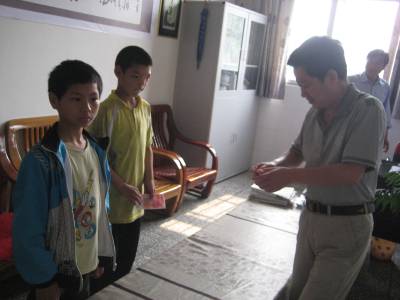 5月23日,宜城市刘猴镇政府党委委员宋国江带领镇妇联工作人员,来到刘猴小学,看望慰问陈万群、王新越两名特困“留守儿童”,并为他们发放了两百元的助学金,提前送来了“六一”祝福。 (本报视界网 周卫华 摄)