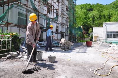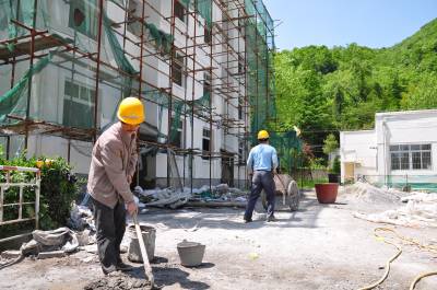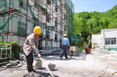 5月23日,在恩施市板桥镇中心小学农村周转房建设现场,工人师傅和水泥砂浆、斗斗车运送装潢材料、粉刷墙壁,装饰装潢忙。