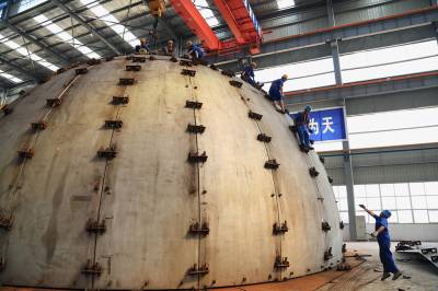 这台球罐为双层球罐,按照当前国际上最权威的美国机械工程师协会标准制造,共由62块壳板组成,内罐采用不锈钢为原材料,外罐材质使用碳素钢,设计压力0.5兆帕,用于储存零下196℃的液化天然气。整台球罐直径长达17米,容积为2500立方米,是目前国内容积最大、壳板最厚的不锈钢低温球罐。中国压力容器协会提供的资料显示:此前国内厂家制造出的同类材质球罐,容积最大的是2000立方米。