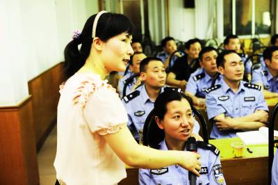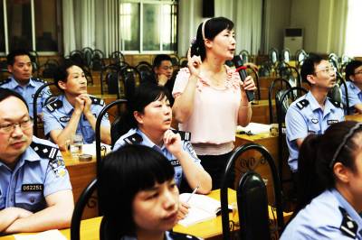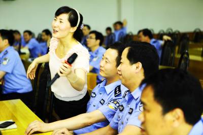 5月23日,在秭归县公安局“民警学说普通话”的培训课堂,老师走下讲台与民警学员互动,指导民警对照前方投影中的“字”、“词”、“句”,咿呀学舌般地进行发音练习。秭归县地处长江三峡工程坝上库首,拥有长江三峡风景、三峡水电工程、屈原文化名人等世界级的文化旅游资源,是“一江两山”(长江、神农架、武当山)旅游线路的重要组成部分。为了更好地服务中、外游客,展示“中国警察”的良好形象,秭归县公安局将“说好普通话”作为民警必备的基本功,集中进行强化教育训练,要求在今年6月前全部达到国家确认的“三级甲等”以上水平。