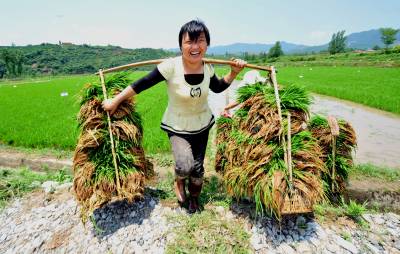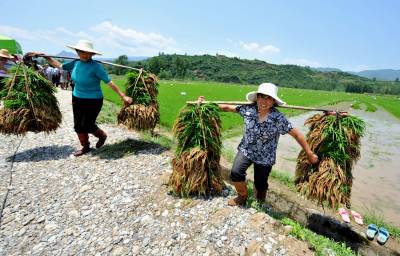 5月27日,湖北省南漳县巡检镇汉三村农民正将拉好的秧苗挑往大田移栽。巡检镇是有机农业的示范镇,也是富硒大米的主产区。当地农民抓住天气的时机抢收抢插,确保秋粮丰产丰收。据悉,南漳县是襄阳粮食的主产区,共有水稻面积35万亩,年产值53143万元 。