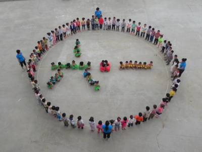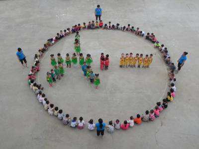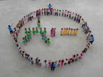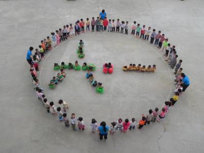 新农村幼儿喜迎“六一” 5月28日,十堰市郧县青曲镇中心幼儿园的幼儿在校园里拼成“六一”字样图案,迎接国际儿童节的到来,表达对节日的期盼与祝福。 (本报视界网 张传郧 摄)