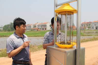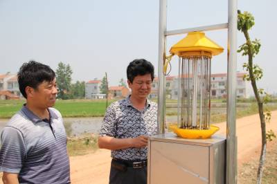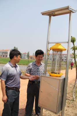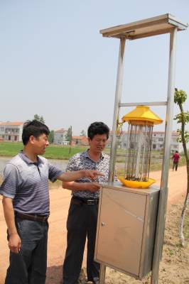 太阳能灭蛾灯进驻稻田 5月22日,在汉川市里潭乡杨林垸高产水稻田,技术员查看太阳能灭蛾灯。杨林垸万亩高产水稻田广泛使用对农作物安全无毒害的太阳能诱虫灭虫装置,受到群众一致好评。 视界网刘晓平、廖汉文摄