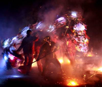 2月22日,虎年元宵节将至,咸宁市咸安区高桥镇农家民龙灯队走村串户,迎接元宵佳节的到来。詹文峰摄