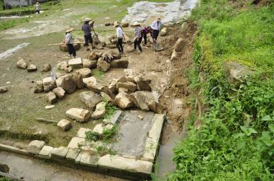 5月26日,咸丰县唐崖土司城遗址现场,民工在考古专家指导下清理地下文物。