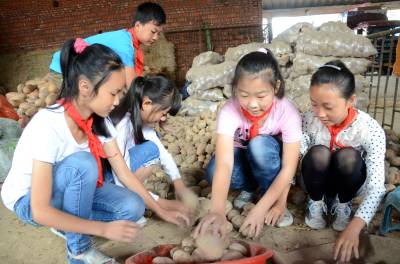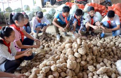 5月30日,小学生在学习挑选土豆。宜昌市万寿桥小学30余名6年级学生在老师的带领下,来到该市金桥蔬菜批发市场参加劳动。据该校负责人称,万寿桥小学有85%的学生来自四川、重庆农村,随父母打工来到这里。学校组织劳动,让他们感受父母工作的艰辛,珍惜学习的机会,孝敬父母,回报社会,过一个有意义的儿童节。 (记者 杨平 摄)