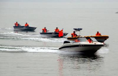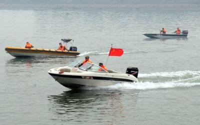 5月30日,武警战士驾驶着冲锋舟进行救援演练。驻守葛洲坝武警宜昌市支队船艇大队的官兵,增加水上救援训练的频率,既要提高水救援的能力,更要加强战士水中生存的本领,为即将到来的防汛抗洪救援作准备。 (记者 杨平 摄)