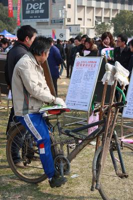 2月22日,在汉川市大型劳动力招聘会上,来自仙女山办事处的一名腿部有伤的中年人在认真查看招聘启示。伤残农民工在应聘就职上比一般人存在更多一些困难。