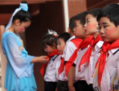 图片:光荣入队 5月31日,武穴市思源实验学校举行少先队新队员入队仪式,120名小学生光荣地加入少先队组织,戴上红领巾。(吕浩生)