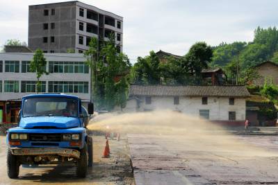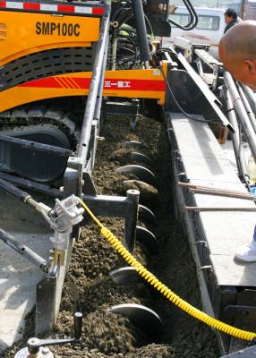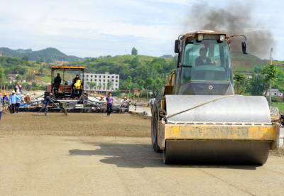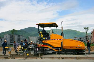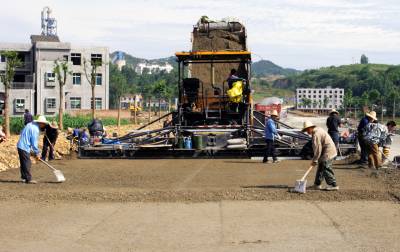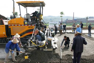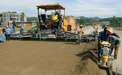 5月31日,竹溪县绕城大道(北环路)建设施工人员在竹溪水坪黄龙,北环路与305省道(襄关路)交叉道口接线段操作大型筑路摊铺机摊铺路面基层水泥混凝土稳定砂。