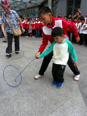 乡下小学生进城教小朋友推铁环