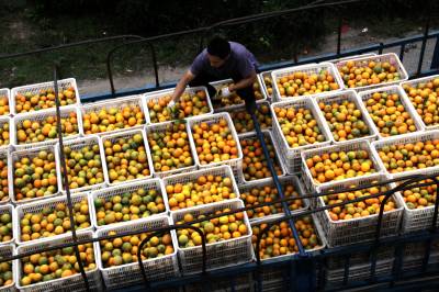 6月1日,柑农正在将夏橙装箱上车。据悉,在三峡河谷地带,经过精心培育出来的夏橙,具有“果形端正、橙黄光滑、肉脆化渣、酸甜适度、风味浓郁、富有香气”等特点,是柑橘错季销售、调节水果市场的时令果品,深受国内外消费者青睐,已经成为当地柑农增收致富的“黄金果”。目前,素有“中国夏橙之乡”美誉的三峡库区秭归县泄滩乡1.5万亩夏橙已经成熟上市,当地柑农正抢抓季节采收销售。