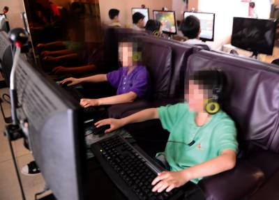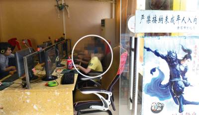图一:该网吧的门口贴着文化部门严禁为成年人进入网吧字样,而几名小学生就在旁边若无其事的上网。(图二)几名小学生在该网吧内上网。