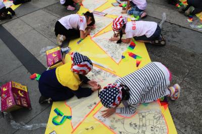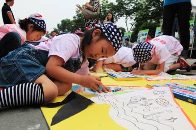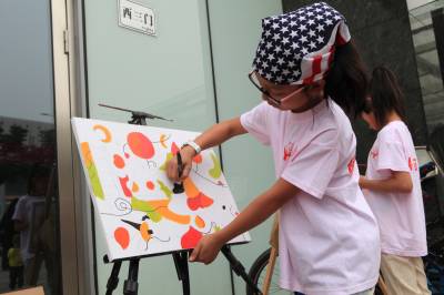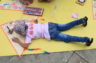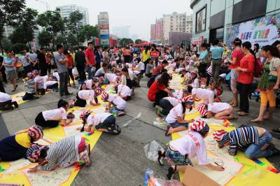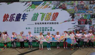 儿童节期间,在湖北大冶雨润国际广场上,近百名杨杨画室的宝宝参加了由大冶摄影家协会和大冶杨杨画室联合举办的快乐童年、放飞希望—彩绘风筝美术实践活动,孩子们兴致勃勃地在自己喜爱的风筝上画着童年的美好和梦想。 视界网:宫少华摄影报道