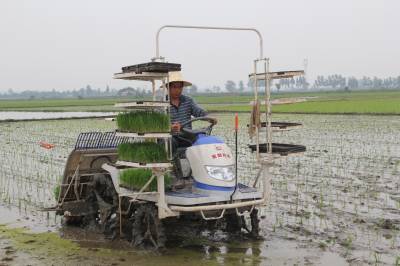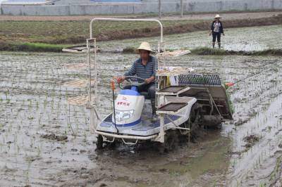 5月31日,乘坐式插秧机在汉川市刘家隔镇条沿村严新华稻田里“驰驰骋”,14亩中稻不到5个小时就插完。机械化插秧既能够增加农民收入,又能够降低劳动成本,已成农民的新宠。汉川是全省重要商品粮食生产基地,该市突出培植水稻集中育秧市场主体,充分发挥农机合作社、育秧大户、农业龙头企业和种粮大户的引导带动作用,开展经营性集中育秧,强化农机农艺融合,农业和农机部门加强技术指导和做好农机作业组织及技术服务工作。该市今年中稻种植面积57多万亩,计划中稻机插面积16万亩。