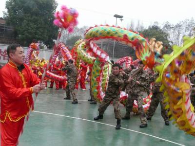2月26日(正月十三)中午,江汉区满春街干部居民群众,敲锣打鼓,簇拥4条五彩龙,来到解放军武汉后方基地通讯站慰问,与该站官兵和新战士组或的2条龙欢聚一堂,龙腾虎跃齐舞龙同欢乐,共贺新春庆虎年闹元宵,再现了军民共建"双拥"和"三个文明"建设20余年的鱼水深情。