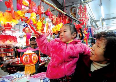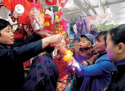 元宵节临近花灯市场红火26日,黄石市一名妇女抱着孩子在上窑新城批发市场挑选造型花灯。元宵节临近,我市花灯市场十分红火,许多市民购买花灯,喜迎元宵佳节。黄石市黄石日报邱孝威摄