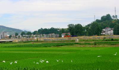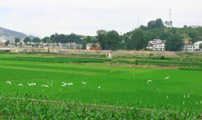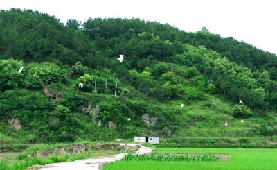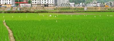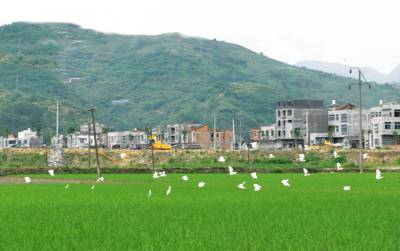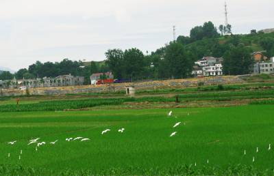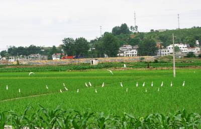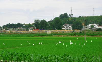 5月31日,竹溪水坪黄龙喜见白鹭群在绿油油的秧田嘻戏,在天空翩然起舞,还有叽叽喳喳黑身白脯喜鹊和白鹭同欢。
