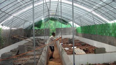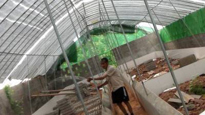 6月4日,在巴东溪丘湾乡白虎坡村5组,74岁的张益国正在蜈蚣养殖大棚喷水降温保湿。去年,张益国的儿子张明芳在外打工,发现养殖蜈蚣很赚钱。回家后建了一个200平方米的养殖大棚,目前种蜈蚣已安家落户,总投资达15万元。明年有望销售商品蜈蚣。据了解,蜈蚣有极高的药用价值,养殖前景不错。(本报视界网 陈开平 周俊)