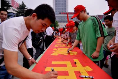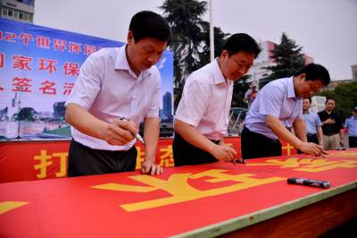 活动当天,万名市民在活动现场红色环保条幅上签名。