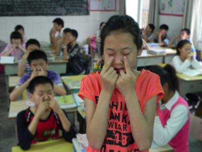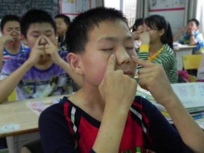 孩子眼睛好 世界更精彩 今日是第18个全国“爱眼日”,今年“爱眼日”的活动主题为“汇聚中国梦,2016年前消灭致盲性沙眼”。十堰市郧县各学校把眼保健操作为学生爱眼护眼的重要举措,同时通过科普宣传、专家讲座、技能培训、视力检测、预防治疗等形式,帮助少年儿童掌握爱眼护眼知识,增强爱眼护眼意识和技能,养成科学用眼、正确护眼的好习惯,提升少年儿童健康水平。图为 6月6日,郧县青曲镇初级中学学生在做眼保健操。(本报视界网 张传郧 摄)