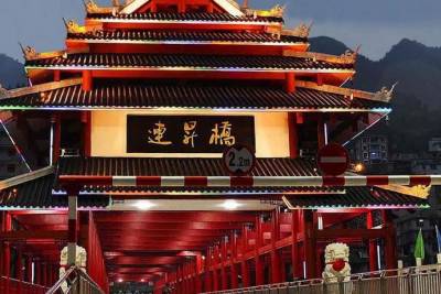 鹤峰人将这座桥命名为连升桥,既是昭示对民族先烈的纪念和缅怀,也是体现对新鹤峰人的鞭策和鼓舞。鹤峰连升桥2013年元旦建成通车,可人、车通行,全长120米,桥面宽17.8米,桥梁为廊道桥,工程造价2200万元,系钢筋混凝土连续梁桥,成连接南北城区的重要交通枢纽,是恩施土家族苗族自治州目前最大的一座风雨桥,融合了鹤峰历史、文化元素,将发挥其独特的休闲、观光、旅游等综合功能。(本报视界网 何昌茂摄)