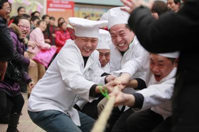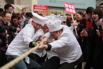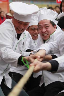 厨师拔河迎元宵2月27日,宜昌城区沙龙宴酒店的20名厨师正在参加拔河比赛。当日,宜昌市总工会门前举行丰富多采的农民工闹元宵活动,来自市内企业和各县区单位的12支农民工代表队参加激烈的拔河比赛,以这一方式喜迎元宵佳节。黄翔摄
