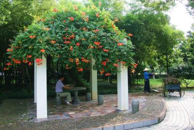 近日,江汉区街头、社区栽种的凌霄花开得正艳,乖巧的凌霄花攀物随形,形成花门、 花亭等有趣景观,令人称奇。据了解,江汉区园林局近年来大力发展垂直绿化,采取多种形式鼓励公园、社区和单位栽种凌霄花、常春藤等攀物植物,扩大绿化面积,收到良好效果。 图一:常青公园的花门 图二:武汉市委党校的花亭 图三:邮三社区的花廊 张垠 摄 武汉市江汉区园林局 430022