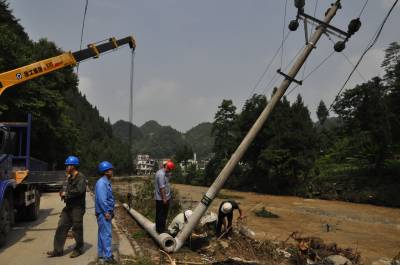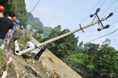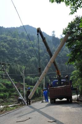 6月8日,宣恩县李家河乡电力职工正在汤湾村抓紧恢复被6.6特大洪水冲毁的电线杆。 6.6特大洪水,该乡被冲毁高压杆21根,低压杆35根,7个台区不同程度受损,导致该乡近20个村停电。据了解,为尽快恢复受灾区群众用电,县电力公司已调集职工紧张投入救灾恢复施工。(本报视界网陈开银 陈贤文) 联系:宣恩县李家河乡政府陈开银 电话:15027217539