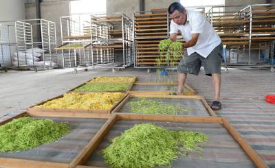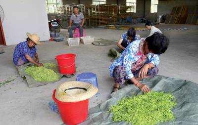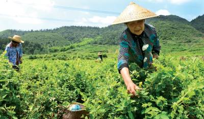 图:一位老人正在金银花基地采花摘金银花。图一:金银花基地采花的人寥寥无几。图二:一名八十多岁的老人柱着拐杖来采花。图三:采花队伍全是老人。图四:公司仓库等着收购金银花。图五:偌大的仓库仅收一点点金银花。图六:一位老人正在金银花基地采花摘金银花。