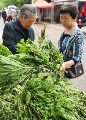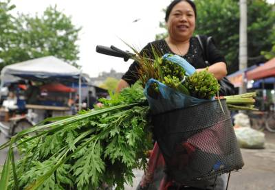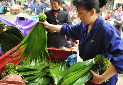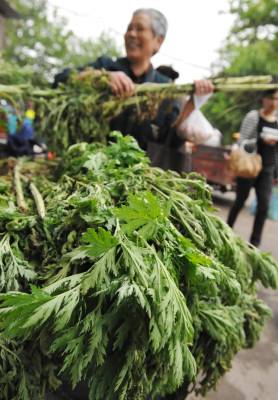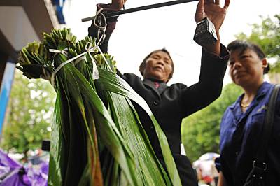 潜江:“叶”来“叶”俏 6月10日,潜江市市民在街头购买粽叶、艾叶。随着端午节的临近,上街采购端午节物品的市民络绎不绝,主打产品粽叶、艾叶越来越俏销。老头老太运送来的一车车粽叶、艾叶一会儿就被抢购一空。 吴燕军 摄
