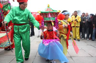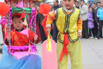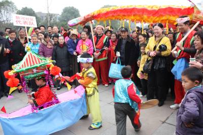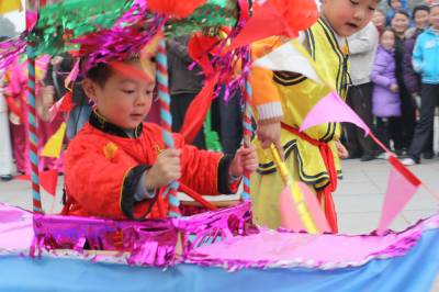 2月28日,沙洋县沙洋镇3岁的周成鹏扮成小船娘,与小伙伴一起划着采莲船送祝福,成为该县民间文艺闹元宵活动的一大亮点。