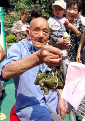 > 武汉95岁老人参加社区包粽比赛格外引人注目