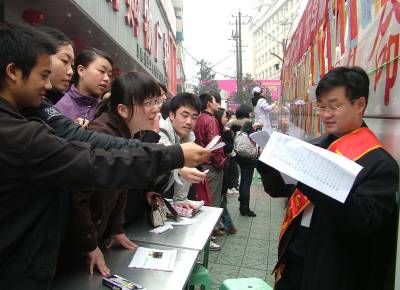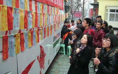 2月28日,几位市民正在州城舞阳坝街头猜灯谜,猜出谜底的人正在急着领奖品。当日,州中心血站在州城舞阳坝、航空路、三孔桥挂出了600个灯谜,猜出谜底者可获赠一个灯笼或一份汤圆。通讯员周光兵摄恩施日报社记者部周光兵13277584567