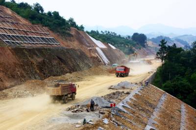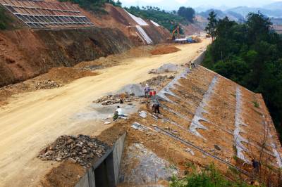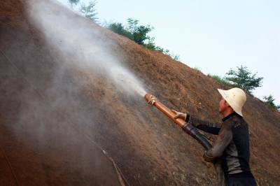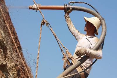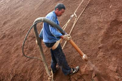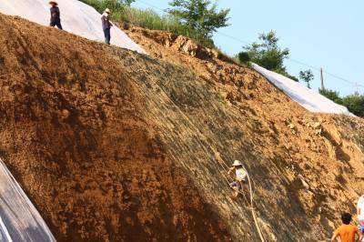 战高温建设环保路 夏日烈火,酷暑难当。6月17日,在谷竹高速公路竹溪县水坪段建设工地上,工人们在高温下对公路上边坡裸露面实施罩面网液压喷播植草作业。 为绿化美化高速公路,保护生态环境,个个都是汗水湿透衣背。(本报视界网王忠春 摄)