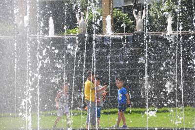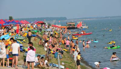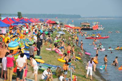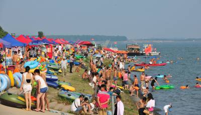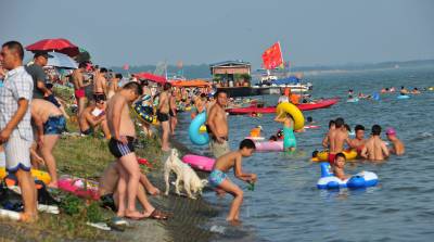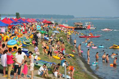 6月15日,市民在湖北省襄阳市汉江鱼梁洲段江岸亲水度夏。 近日,湖北襄阳出现高温天气,高温接近 35°C,不少市民选择在傍晚来临时前往市内汉江亲水区域戏水 消暑。