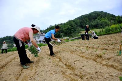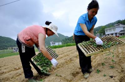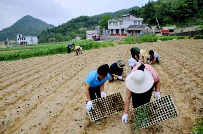 6月16日,在恩施市红土乡石灰窑村石家坪组,10多名留守妇女正在帮忙栽第二季包包菜苗。