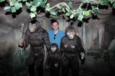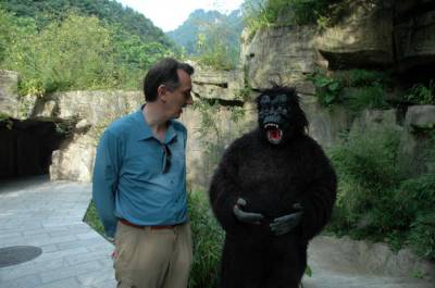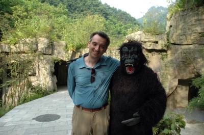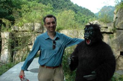14日,联合国教科文组织GGN专家在神农架国家地质公园官门山园区考察,专家伊利亚斯-瓦利亚科斯参观了“野人”洞,兴奋地与“野人”合影留念。