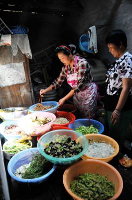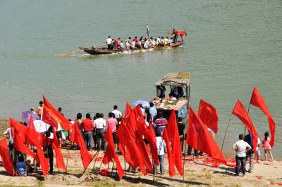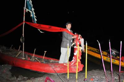 说起郧县龙船会许多人只记的汉江与堵河交汇处中央水中的韩家州,确忽略了汉江北岸的青曲镇店子河,如果没有店子河村的带头发起和重点参与韩家州端午节龙船会将会淡然失色。说起韩家州端午节龙船会有几百年历史,因流经该村的堵河和汉江在此交汇,汉江中心有一座小岛,岛上住的全是韩姓人家因此该岛取名韩家州,又因韩家人是战国名将韩信之后而声名大震。 韩家州端午节龙船会是由堵河口和汉江两岸3个村的村民组成,分为 青龙会、黄龙会、白龙会,为江南柳陂镇2个村,江北青曲镇1个村组成。每逢端午节在外打工和搬走的乡亲都要赶回家乡参加韩家州端午节龙船会比赛,有钱的制作会旗服装及准备投标用的几箱香烟和鸭子,以便各支龙般队在水面上争抢即抢标。因国家南水北调中线工程汉江中的韩家州岛上村民己经于2010年从郧县搬迁到随州市定居去了。韩家州端午节龙船会己经沿续了几百年历史,即使是1947年的解放战争汉江北岸己是解放区,汉江南岸是国统区当年韩家州端午节龙船会照样举办。而2011年的韩家州端午节龙船会又有不同,一是韩家州岛上的居民因国家南水北调中线工程已迁到随州市,二是剩下的两支龙船队也因内安移民身份将在后靠上山而搬迁,为此这几年的韩家州移民派队回乡参赛。2012年韩家州岛上外迁移民代表队的队旗是“韩家州青龙队”,两面红底黄字的“韩家州移民”旗帜。一大早回乡参赛的几名选手将一面旗帜插在了大沙船的船头,鸣笛,鸣炮后大船向上面的堵河口开去。来到堵河口沙船在汉江靠向了韩家州,大家先是在岸上向青龙敬拜并跪在地上烧起香裱和放鞭炮,有几人上岛去上坟,其它人将青龙和会旗装到小船上,九点钟回乡外迁移民选出10名选手上船在鞭炮声中向堵河口划去,上午的比赛是在堵河口内进行,每条大船都有一二十名的年轻人而且都是两班人换着上船比赛,而青龙移民队只有10人还都是中年人只能用小船,整个上午移民全程参赛,飘场的“韩家州移民”旗帜格外引人注目,一上午的参赛共抢标20多条香烟,吃过午饭大船小船开出堵河口来到青曲镇店子河村的汉江段水面上举行比赛,在急流中争抢整条香烟和鸭子,移民们表示明年端午节移民队将多回来几人分两班划大船参加韩家州龙船会,让几百年的韩家州龙船会文化完整的沿续下去。