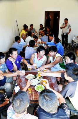 中午太阳高照赛事暂停,家家户户回家吃团圆饭喝雄黄酒吃汉江粽子。而参加龙船会的浆手们不能回家要到村上今年龙首家参加吃会,村上的龙首由每户每年轮流坐桩,即负责每年端午节参赛浆手中午和晚上的会餐,在当地端午节叫吃会,吃会除了参赛浆手和后勤保障村民外还有村上徳高望重的前辈参加,一次摆上十几席,在划上几拳场面十分热闹,这一天是村上举办的盛事。下午其它村上的龙船将龙船划出堵河进入汉江然后逆江而上敲锣打鼓聚集到店子河村江面,举行下午汉江水面的龙船会赛事,汉江与堵河赛事不同在汉江水面变宽,水流变急,顶水划船变的困难。下午赛事如同上午一样往复循环直至太阳落西时方才结束,这时所有龙船在锣鼓声中绕行汉江两岸一周,店子河的白龙船跟在其后向堵河囗进发,将多条龙船送到夲村停靠位置后才返回店子河村,到达停靠位置后方鸣锣放鞭炮焚香纸倒龙头,降龙旗,并将龙旗交给下一年端午节承办吃会的龙首,然后扬手挥动桡子退出江面赛场,龙船在众人的努力下送回龙房等待下一年的龙船会在聚首。