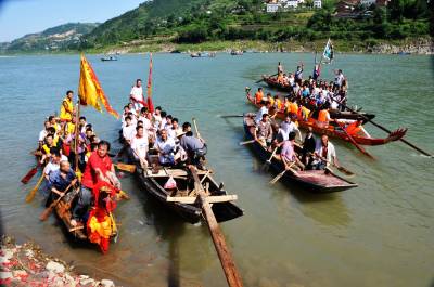 端午节是我国传统的节日,更是纪念著名历史诗人屈原而设立的节日。每年的这天湖北省郧县青曲镇店子河有几百年历史的龙船会都要在汉江与堵河口水面上举行,只见水面上5条船头装有青龙、黄龙、白龙和插有青、黄、白带有龙的龙旗的船只在多名浆手的号子声中在水面中穿梭,整个水面是锣鼓喧天,鞭炮齐鸣,冲天礼花的爆炸声不断,用整条香烟和鸭子投标的回乡成功人士在各处水面放炮投标,所有龙船闻炮即动向炮声炸响的浓烟处而去,去争抢水面上漂浮的多条香烟和鸭子。热闹的场面吸引着车城十堰市和许多外地游客前来观看,岸上的车流人流交汇在一起,给堵河口和汉江交汇处增添了节日的盛装,这就是郧县境内汉江段有百年历史的龙船会,即龙舟前身的原形龙船,春节男丁可以不回家但端午节必须回家,这就是当地的习俗,显示出家家户户对龙船会如此的看重。