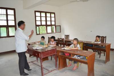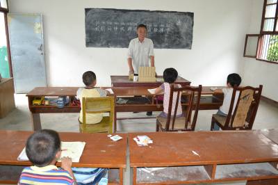 2013年6月20日,湖北省郧县柳陂镇马蹄沟教学点金善国老师在给他的四名学生上课。
