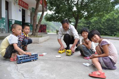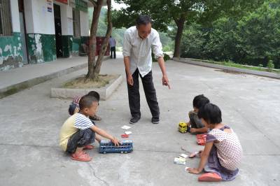2013年6月20日,湖北省郧县柳陂镇马蹄沟教学点金善国老师和他的四个学生一起在室外快乐做游戏。