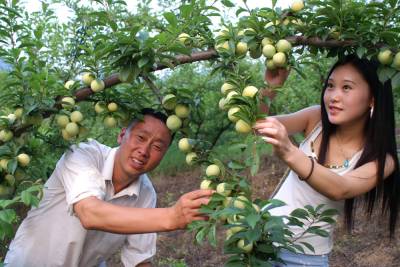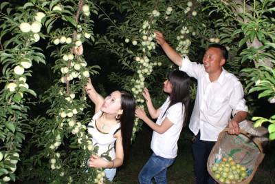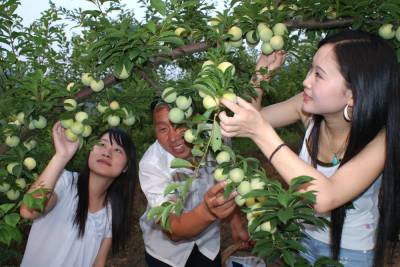 6月20日,数十名游客正在竹山县城关镇莲花村200亩特色果园里采摘高甜度的新品种香梅。莲花村返乡农民工王世伟培育的香梅基地,在果木栽培中积极使用符合无公害标准的高效、低毒、低残留农药以及优质有机肥。其绿色“香梅”,市场十分俏销,娇艳欲滴的果实缀满枝头,每天吸引数十名游客上门采摘、游玩。该县现有特色林果产业园近10万亩,果农们改变了过去单一卖果的经营方式,开发特色果园风情旅游,特色香果成为当地农民甜蜜的产业。