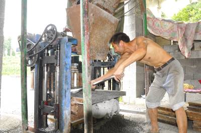 建房热,引来砖俏销 6月22日大河镇芭蕉溪村的水泥砖预制厂里,制砖工人正在紧张的劳作。 据悉:来凤县大河镇今年全镇有水泥制砖作坊十多家,年产水泥空心砖、馒头实心砖600万块,出产价空心砖每块1.8元,馒头在每块0.5元,今年由于建房热拉动水泥砖特别俏销,总是供不应求,有时候还要提前一周预定。仅此一项可以为村民带来8百多万元的经济效益。(本报视界网潘家文)