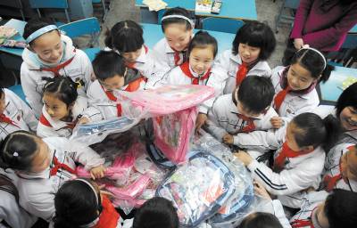 3月1日,铁山三小学生正在领取免费书包。今年,铁山区把向义务教育学校学生免费赠送学习用品确定为该区”十件实事”之一。该区4000余名义务教育阶段的学生将得到由政府提供的价值22万余元的书包、圆规、直尺等学习用品。鄢巍摄